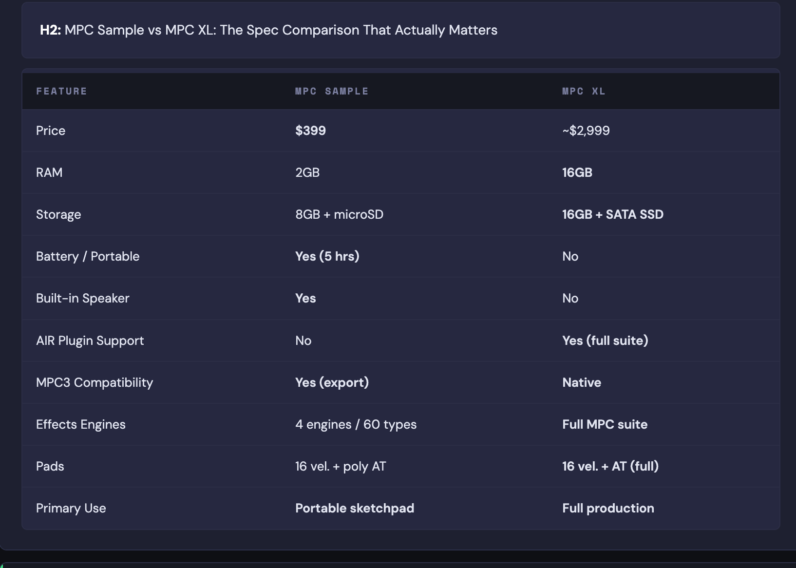 — The absence of plugin support, 16 GB RAM, and the full MPC OS makes the XL irreplaceable for anyone finishing records. The Sample was never meant to go that far.